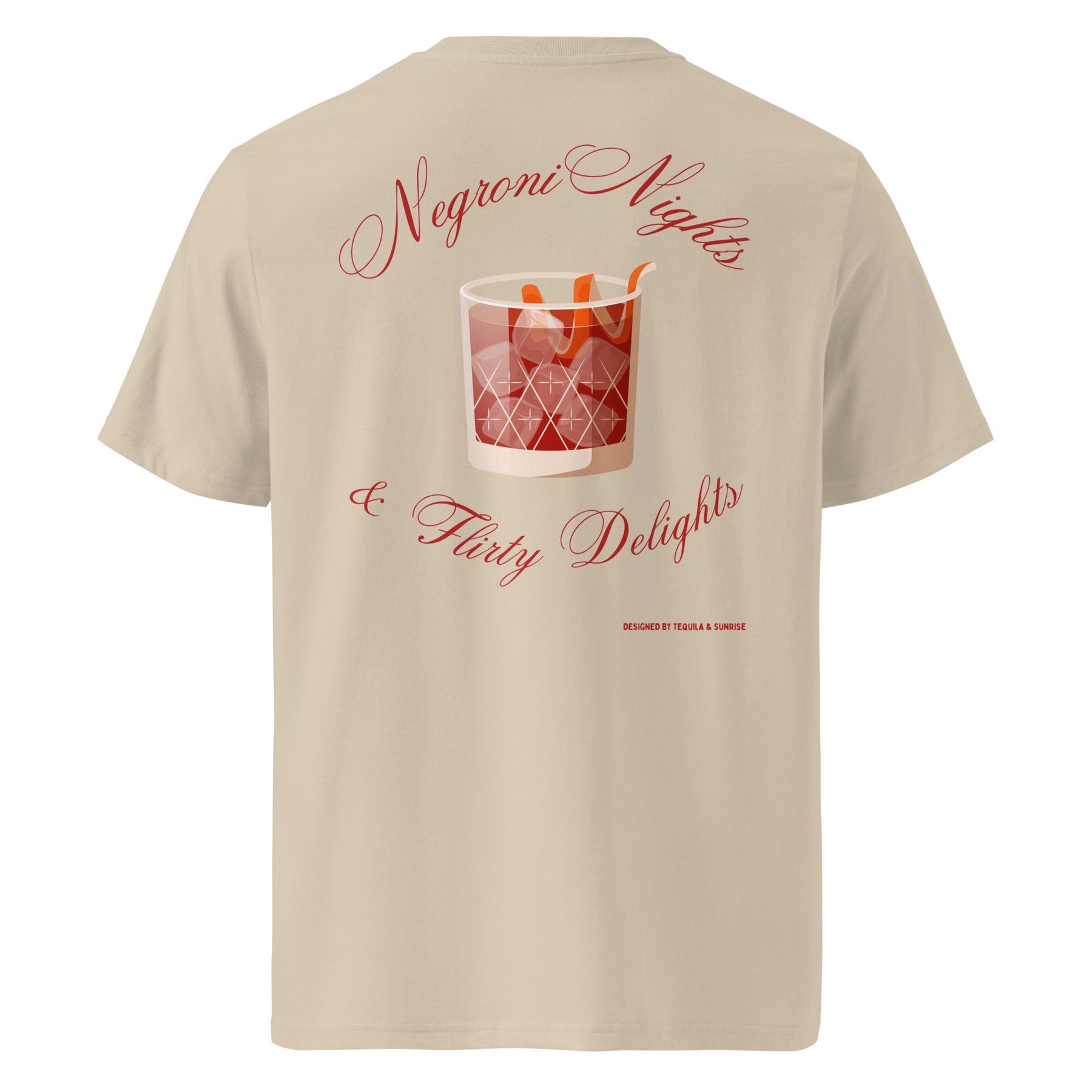 Negroni Nights & Flirty Delights organic t-shirt inspired by late cocktails, playful glances, and unforgettable nights.